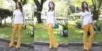 A peça chave da semana, para todos perderem o medo da cor, principalmente usada na parte de baixo é uma Calça Amarela, o tecido dela é de chamois, bem quentinho e confortável, de modelagem boot cut, chamada assim porque não é tão aberta quanto uma flare mas cobre o cano de uma bota, por exemplo.