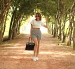 Estampas pequeninas com a mesma cor, preto e branco. Uma blusa com ombro franzinho que ajuda a ampliar o ombro, equilibrar e diminuir o quadril. A saia com shape em “A” listradinha fica levemente armada e super charmosa. O cinto já vem na peça e super facilita a produção.